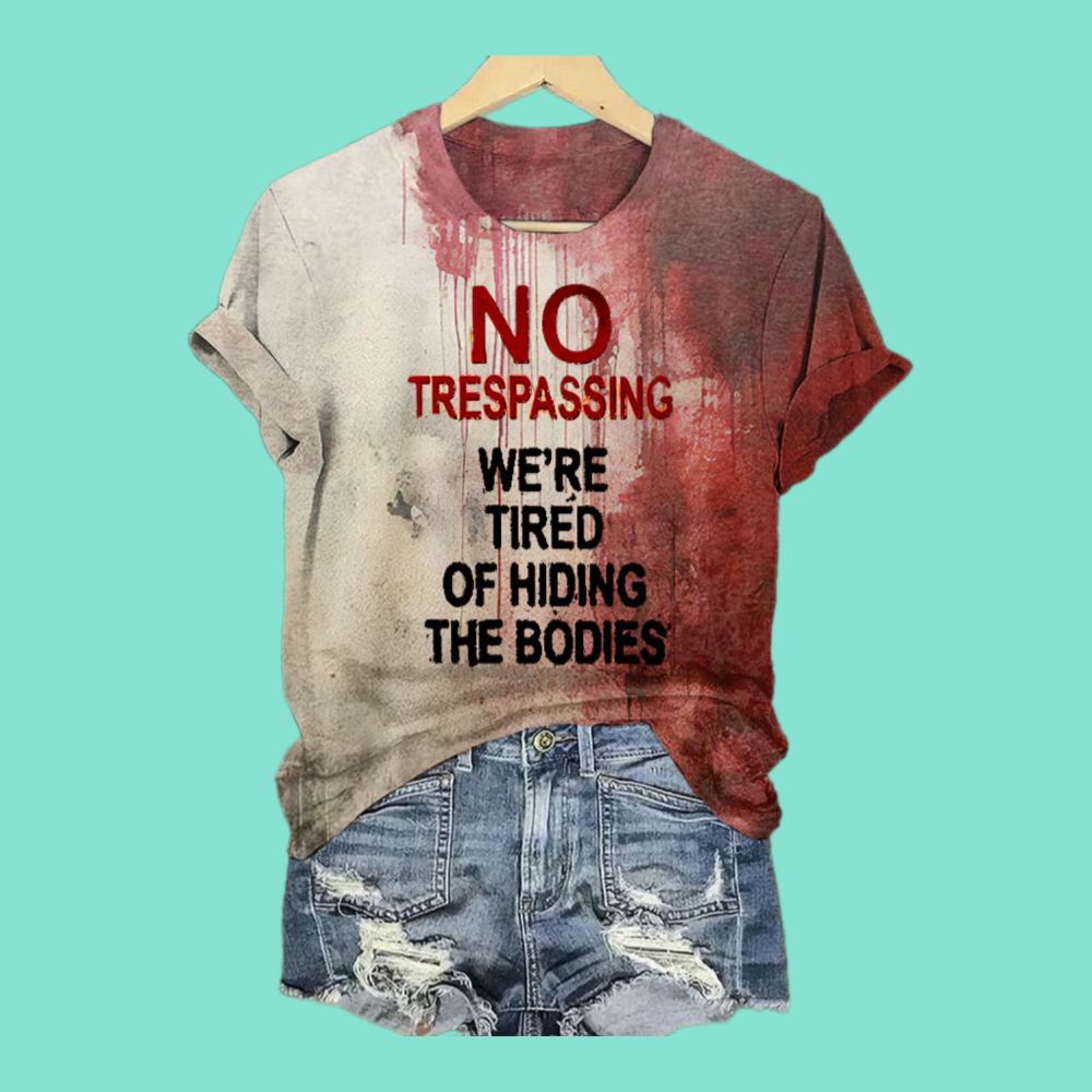 2025 Halloween Women's No Trespassing We Are Tired of Hiding the Bodies Printed Casual T-Shirt
